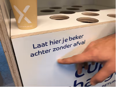 De inzamelmeubels zijn speciaal gemaakt voor onze bekers. Ze zijn stevig en hebben een luxe uitstraling. Meteen een goed herkenningspunt op locatie dus. Bovenin pak je gemakkelijk een schone beker, onderin kan je de gebruikte bekers kwijt. Die gaan meteen een doos in, voor extra hygiëne.